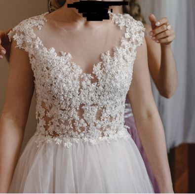 Tiul na ramionach i plecach (koszulka) jasno cielista NIEWIDOCZNA. Suknia zapinana od boku.