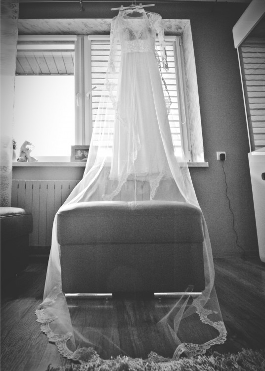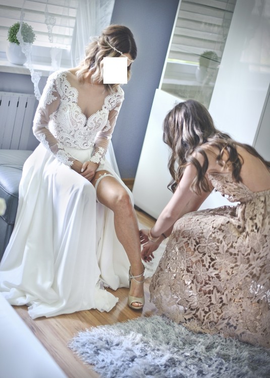 Góra sukienki wykonana jest z siateczki oraz grubej gipiury, natomiast dół sukienki składa się z wielu warstw lejące materiału. Dodatkowo do zaoferowania mam piękną złotą opaskę z kamieniami, którą można wykorzystać jako dodatek do włosów na wiele sposobów.