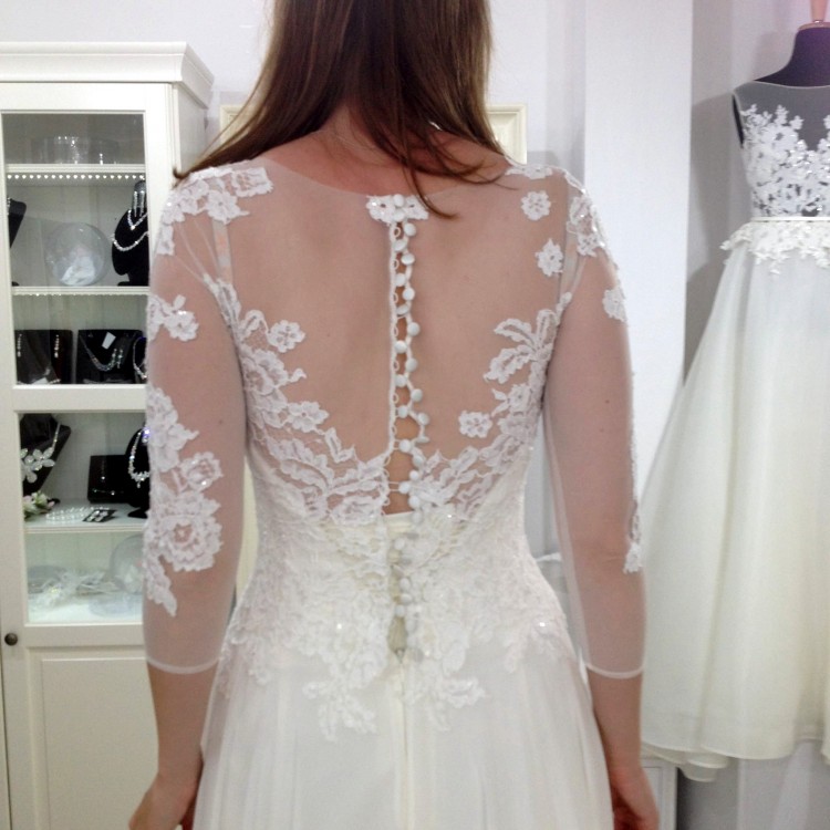 Suknia z muślinu, w kolorze jasnego ecru, obszyta delikatnie mieniącymi się koronkami.