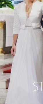 Do sukni szylam także wykonany na zamówienie żakiet typu Chanel'ka. W razie zainteresowania, także może zostać dołączony do sukni. Serdecznie zapraszam do mierzenia. Suknia jest naprawdę piękna. Cena w salonie to 3400 zł . W razie pytań proszę o kontakt. Pozdrawiam.