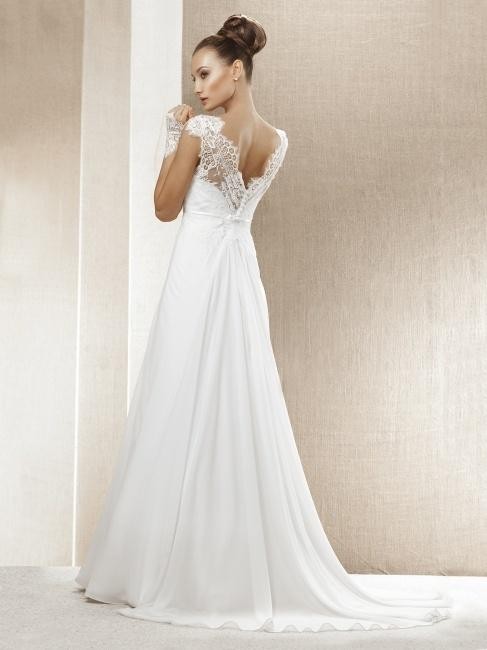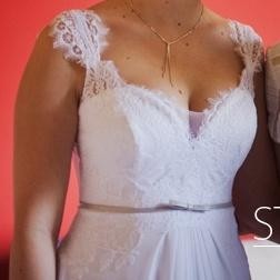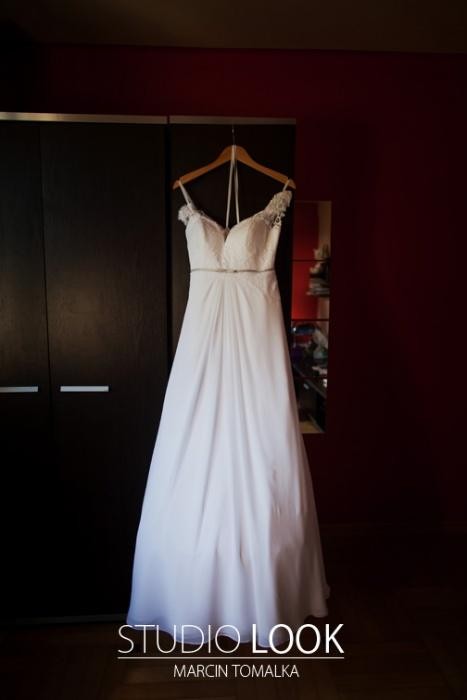 Witam. Mam do sprzedania piękna suknie ślubną. Suknia została zakupiona w krakowskim salonie sukien ślubnych Nabla. Model sukni to Lili. Suknia wykonana jest z muślinu i ozdobiona piękna wloska koronką. Suknia odcinana jest pod biustem, co podkreśla delikatna szara wstazeczka która była dopasowana do koloru butów. Ramionka są cienkie wykonane jedynie z koronki. Piękny głęboki dekolt, podkreślajacy biust oraz mocno wycięte plecy sprawiają że suknia jest lekka w odbiorze ale tym samym bardzo elegancka i kobieca. Rozmiar sukni, a raczej górnej części to 38, gdyż suknia jest odcinana pod biustem i puszczona. Suknia posiada także tren który podczas wesela można swobodnie podpiąć, dla większego komfortu tańca.
