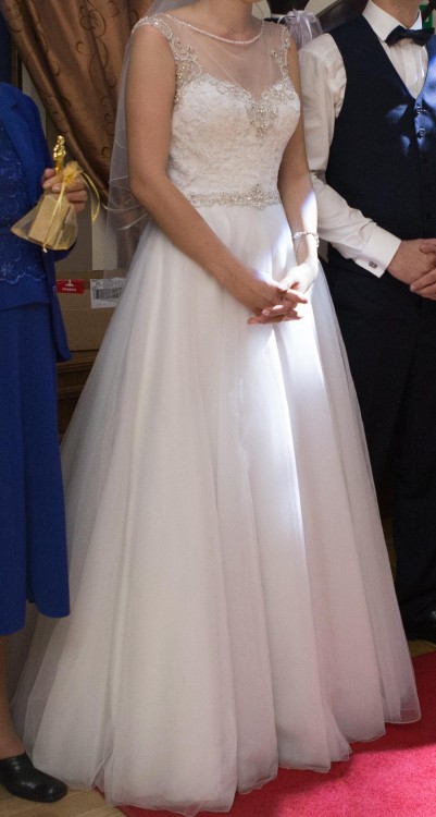 Mam do sprzedania suknie ślubną Sincerity 3943 z salonu Anna z kolekcji 2017 Suknia jest w kolorze białym. Suknia w rzeczywistości prezentuje się jeszcze lepiej niż na zdjęciach. Wykonana jest z wysokiej jakości materiałów. Dół sukni wykonany jest z delikatnej organzy, natomiast góra sukienki jest wykonana z koronki oraz obszyta różnego rodzaju kryształkami co dodaje kreacji szyku i elegancji. Suknia posiada tren z możliwością podpięcia.