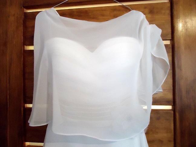 Do sukienki dołączam welon oraz piękną narzutkę, która świetnie sprawdzi się podczas ceremonii zaślubin.