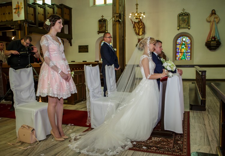 Suknia ma pięknie wykończone plecy oraz posiada długi tren widoczny na zdjęciu.
