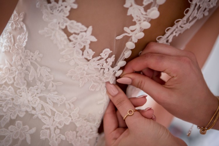 Suknia zapinana na zamek oraz na drobne guziczki widoczne na pierwszym zdjęciu.