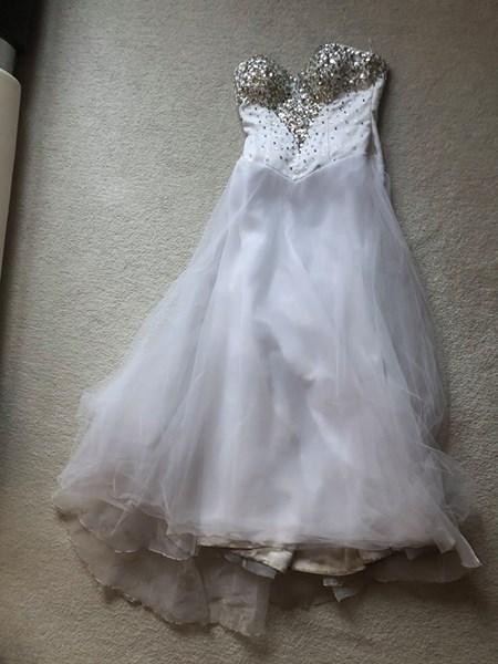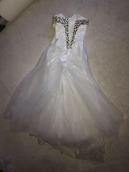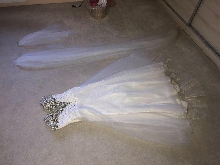 Jest ona do czyszczenia po sesji plenerowej, zabrudzenia widać na zdjęciach. Brak uszkodzeń sukni. Cena = 500zł do niewielkiej negocjacji. Dla zainteresowanych gratis dwa welony (krótki i długi). Dodatkowo możliwość kupna bolerka jak na zdjęciu (koszt 50 zł). Suknia bardzo wygodna i pięknie prezentuje się na zdjęciach.