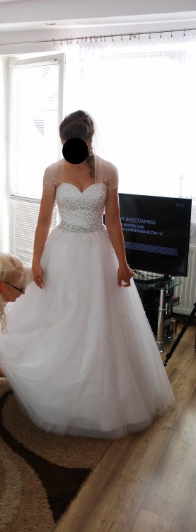 Witam, mam na sprzedaż przepiękną suknię ślubną w rozmiarze 36/38. Suknia została kupiona w salonie sukien ślubnych " Emily" w Bydgoszczy za cenę 3300zł. Model sukni z roku 2017. Suknia jest w stanie idealnym , po profesjonalnym czyszczeniu . Ubrana tylko raz na uroczystość weselną. Góra sukni ozdobiona koralikami oraz kryształkami które ślicznie się mienią . Gorset wiązany z tyłu. Dół wykonany z 6 warstw tiulu . Wierzchnia warstwa również pokryta mieniącymi kryształkami. Suknia szyta była na wzrost 170cm + 6cm obcas.