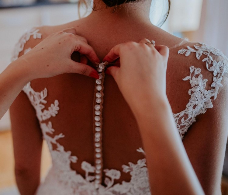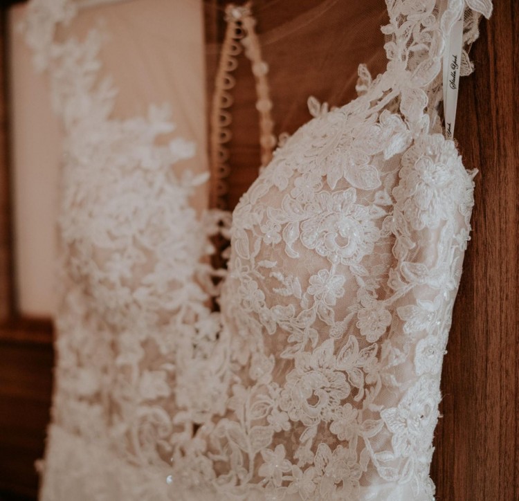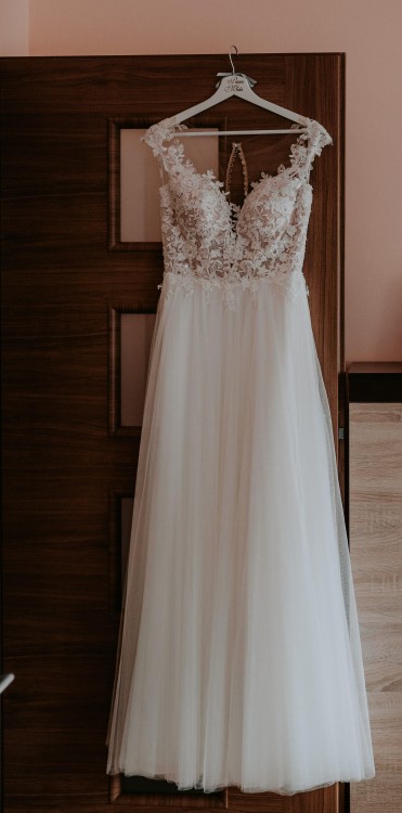 Góra sukni jest koronkowa, zdobiona delikatnymi koralikami, które mienią się w tańcu. Gorset jest zapinany na perłowe guziczki, z przodu i z tyłu ma praktycznie niewidoczną siateczkę. Dół sukni tiulowy, zewnętrzna warstwa - do delikatnych poprawek.