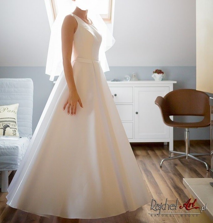 Suknia jest wyczyszczona w pralni chemicznej, jest w idealnym stanie. Szyta na 170-175cm, swobodnie można ją skrócić i zachowa swój fason. Pięknie rozkloszowana, a koło, które dołączam do kompletu idealnie ją dopwłnia. Idealnie układa się zarówno na dole jak i na górze.