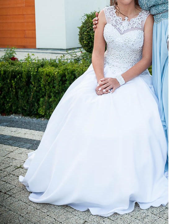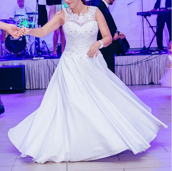 Sprzedam suknię ślubną, szytą na zamówienie w salonie ślubnym. Gorset wysadzany w całości ozdobnymi kamieniami, bardzo efektowna. Dekolt to ozdobna koronka również ozdobiona kamieniami. Spódnica gładka, obszerna, z dwoma ukrytymi kieszeniami. Szyta na wzrost 165 cm, gorset w rozmiarze 38/40. Pierwotna wartość sukni to 3800 zł. Do sukni mogę dodać również koło oraz dwa welony - długi gładki oraz krótszy ozdobiony delikatnie perełkami. W razie pytań proszę o kontakt pod nr telefonu. Cena do negocjacji!