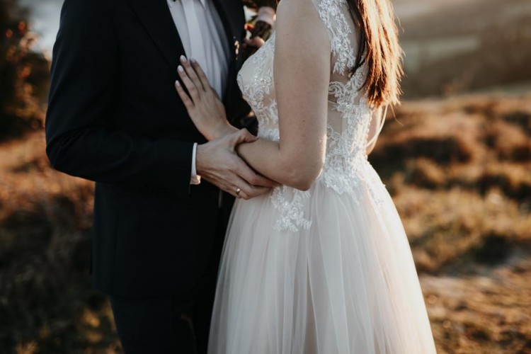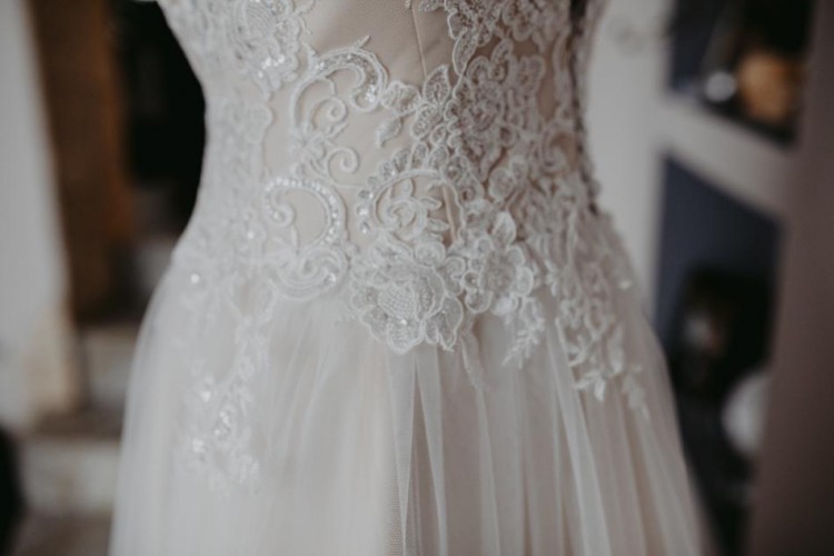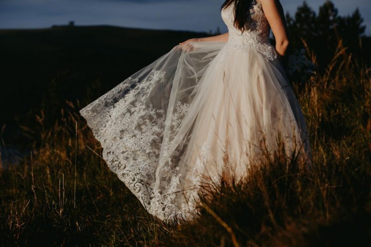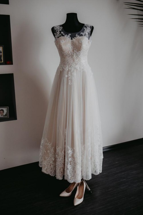 Piękna suknia ślubna w unikatowym kolorze beżu/brzoskwini z wierzchnią warstwą białej koronki.