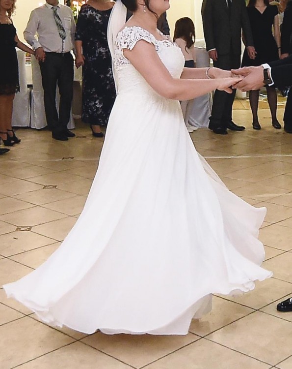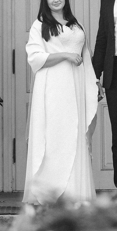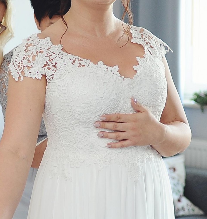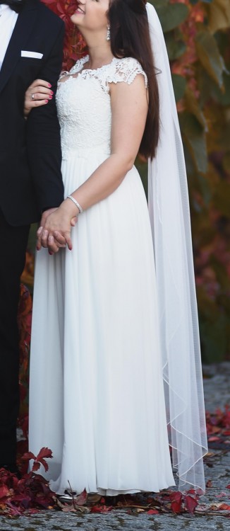 Witam, polecam suknię ślubną projektu Patrycji Pardyki. Suknia szyta na miarę (rozm. 40/42 162cm + obcas 9cm) w kolorze śmietankowym. Suknię śmiało mogą założyć panny młode, noszące mniejszy rozmiar, ponieważ posiada sznurowany gorset. Góra: przedłużony gorset pokryty muślinem i gipiurą. Dół: muślinowy. Suknia bardzo wygodna, pięknie układa się w tańcu. Do sukni dorzucam szal (użyty jedynie na sesji zdjęciowej, na szczęście pogoda ślubna dopisała) oraz prosty tiulowy welon 170cm. Zapraszam do kontaktu :)