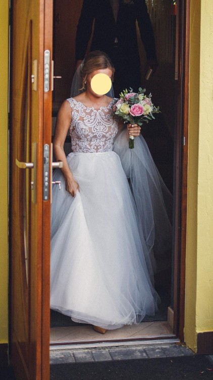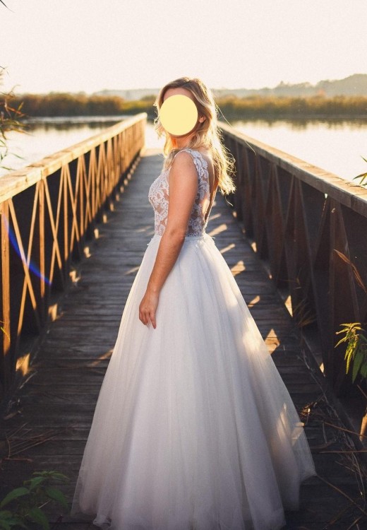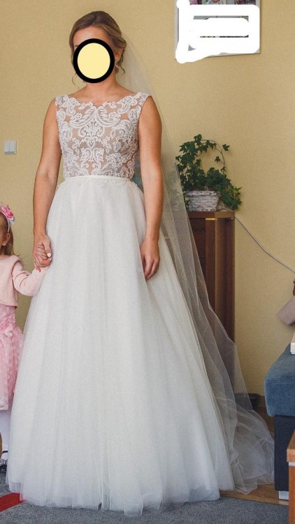 Mam do sprzedania piękną suknię ślubną szytą na jesień 2018 r. Rozmiar 34/36. Suknia szyta na wzrost 162 cm + 9 cm obcas. Góra koronkowa z błyszczącymi przezroczystymi koralikami, które pięknie się mienią w słońcu. Dół klasyczny tiulowy. Cena zakupu 3000 zł.