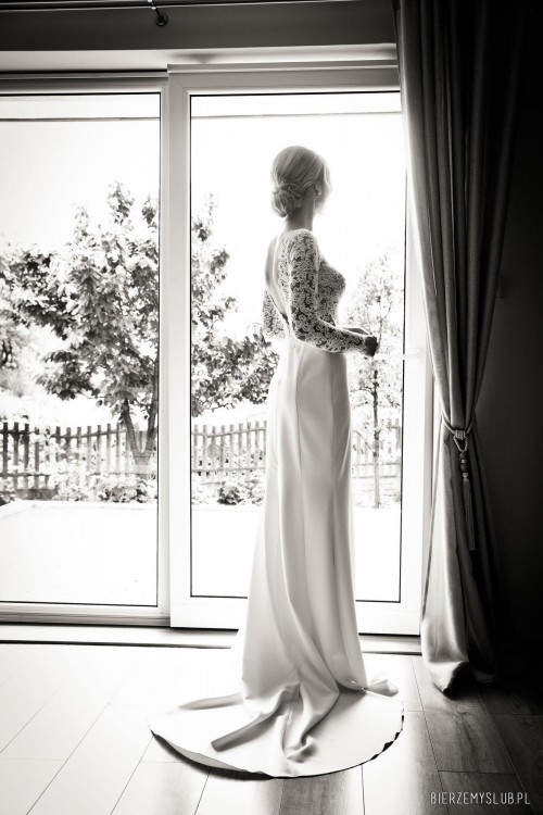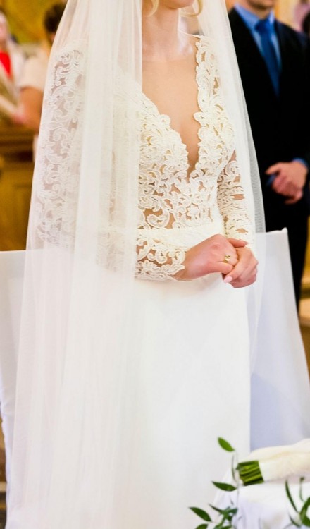 Sprzedam suknie ślubną rozm.XS/S . Góra sukni z pięknej koronki dodatkowo naszywana koralikami. Z przodu głęboki dekolt , wszyte cieliste miseczki. Dół sukni gładki ,dopasowany z długim trenem. Suknia z długim rękawem z pięknie wykrojonymi plecami. Suknia kupiona w salonie Madonna. Stan idealny- jak nowa. Szyta na wzrost 170cm plus 10cm szpilki. Suknie można skrócić. SUKIENKA WYPOŻYCZĘ LUB SPRZEDAM.Suknie można przymierzyć Bielsko Biała , Wadowice , Oświęcim, Kety .