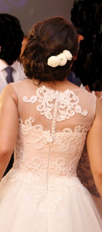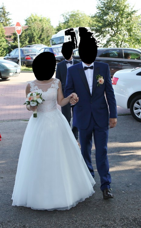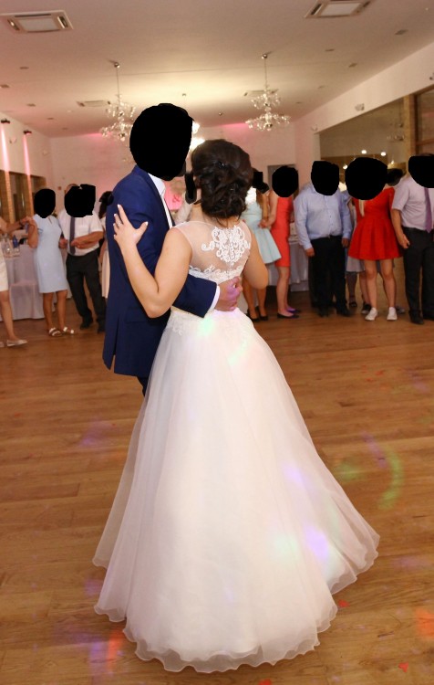 Suknia jest bardzo piękna i delikatna, w żaden sposób nie przyćmiewa urody Panny Młodej, a wręcz ją podkreśla. Do sukni dołączam również welon na grzebyku o wymiarach 50/60 obszyty pięknymi kryształkami, takimi samymi jak wykończenie gorsetu w okolicy szyi. Suknia została wyprana w profesjonalnej pralni, nie posiada żadnych uszkodzeń. Jest jak nowa.