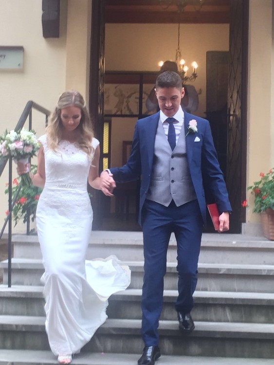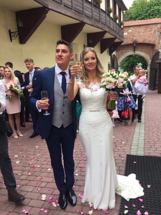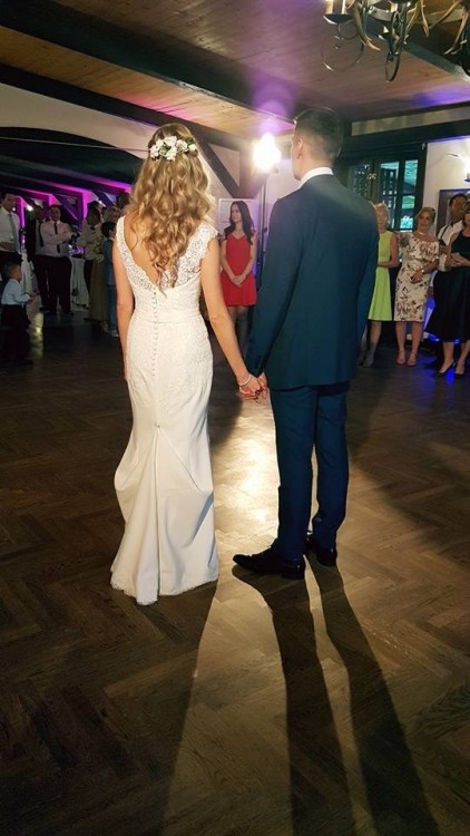 Suknia bardzo wygodna i lekka, idealnie podkreslajaca kobiece ksztalty. Kokardka zostala zmieniona na delikatny pasek wyszywany krysztalkami (nadal posiadam oryginalna kokardke gdybys chciala zamienic). Dodalam rowniez koronke na trenie aby wykoczyc caly "look"