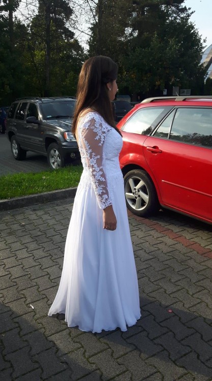 Suknia uszyta według własnego projektu w salonie sukien ślubnych, rozmiar 36-38. Góra koronkowa, dół prosty, z tyłu piękny efektowny dekolt, welon w zestawie. Suknia, co ważne jest bardzo lekka.