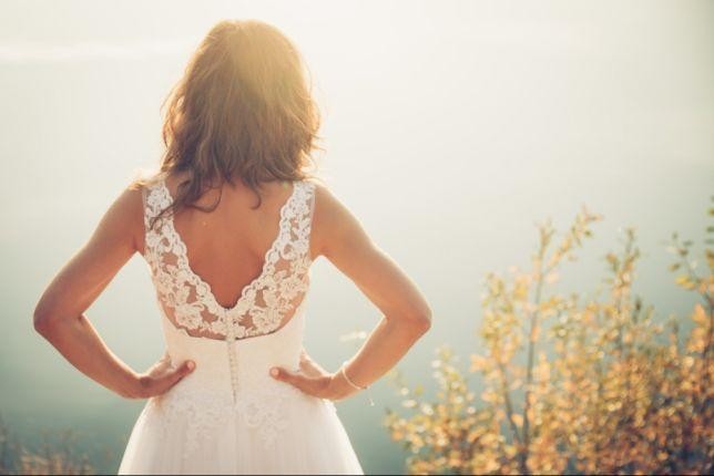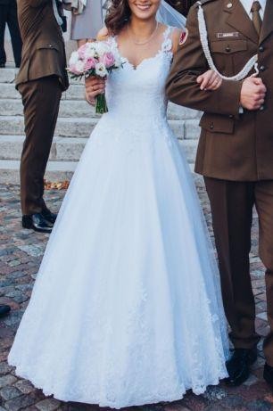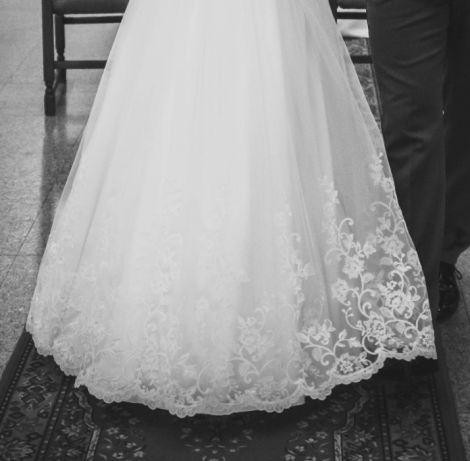 Sprzedam suknię ślubną, szytą na miarę, wzrost 169 cm + 9 cm, w rozmiarze 34-36.