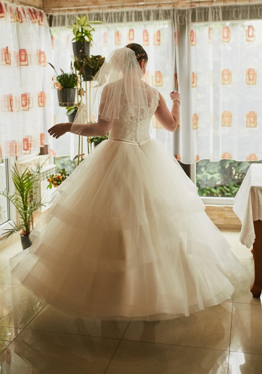 Mam na sprzedaż przepiękną suknię ślubną kupioną w salonie La Perla Sposa w Poznaniu w rozmiarze 38/40 szytą na wysokość 170cm + 8cm obcas. W przypadku kupna mam do polecenia super krawcową, która śmiało zwęży/poszerzy/skróci jeśli będzie taka potrzeba (model sukni na to pozwala). Suknia jest wykończona krynoliną, z tiulowym, warstwowym dołem oraz zdobionym gorsetem. Suknia jest zapinana na tzw zamek ukryty (przykryty pięknymi kryształowymi guzikami) na gorsecie naszyta jest tzw koszulka - która sprawia, że suknia jest przez cały czas na miejscu nie zsuwa się. Cudownie pracuje w tańcu, robiąc niesamowity efekt. Dodatkowo mimo tego, że dół jest spory jest bardzo lekka i wygodna. Idealna na letni jak i zarazem zimowy ślub.