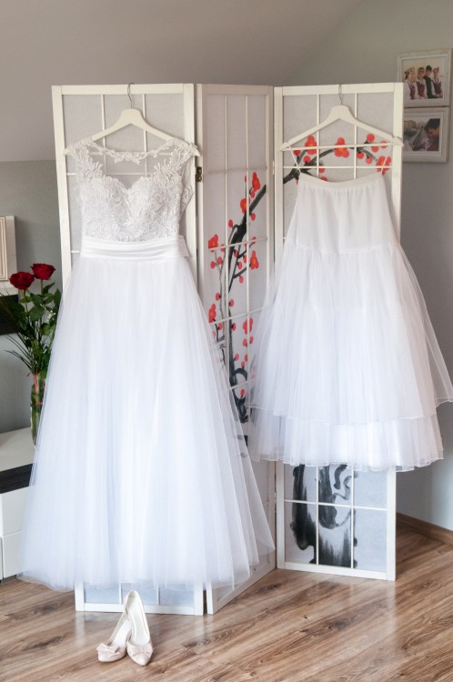 Pięknie wykonana, baardzo wygodna i lekka. Pod guziczkami znajdują się sznurki, dzięki którym można dopasować suknie od rozmiaru 34-36, a jednocześnie nie są one widoczne. Dodatkowo posiadam welon 3m oraz białą etolkę, oczywiście gratis do sukni. Istnieje możliwość zakupu dodatków (kolczyki, bransoletka) oraz buty rozmiar 35-36.