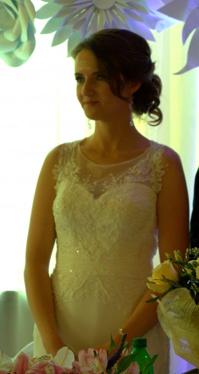 Suknia zakupiona w krakowskim salonie Agnes w kwietniu, wartość sukni 3100 zł. Suknia w kolorze biel/krem, bez trenu, bez koła, zapinana na zamek plus guziki na pętelki. Góra to koronka na delikatnej siateczce, ozdobiona kryształkami, tył sukni tworzy modny efekt koronki na siateczce. Suknia w kształcie syreny, ale bardzo wygodna w tańcu. Szyta na 169 cm + 7 cm obcas. Nie ma potrzeby kupowania specjalnego stanika - suknia ma wszyte miseczki. Szyta na: biodra 94 cm, talia 67 cm. Suknię sprzedaję po znacznie obniżonej cenie - ma kilka uszkodzeń - wymaga cerowania w trzech miejscach na dole sukni (zahaczenie od obcasa), oraz przyszycia zdobienia na siateczce pod pachą.