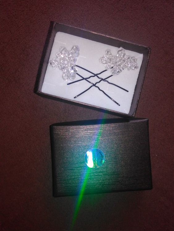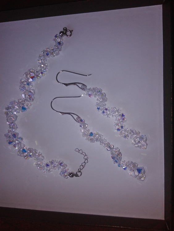Do sukni dodaję pełen komplet mojej ślubnej biżuterii o łącznej wartości 250 zł: kolczyki, bransoletka i dwie kokówki - wszystko z idealnie pasujących do sukni kryształków Swarovskiego.