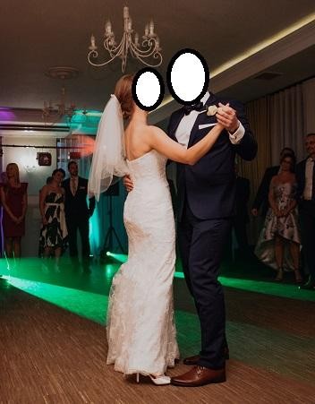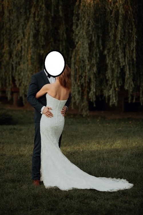Jest to delikatna syrena w kolorze kości słoniowej (Ivory), przylega do bioder, lecz subtelnie rozszerza się w udach, co zapewnia komfort chodzenia, tańczenia, siedzenia czy przyklękania. Suknia jest oparta na sznurowanym gorsecie i następnie zapinana na zamek kryty zapinanymi guziczkami- pięknie się trzyma, nie opada i się nie przesuwa.