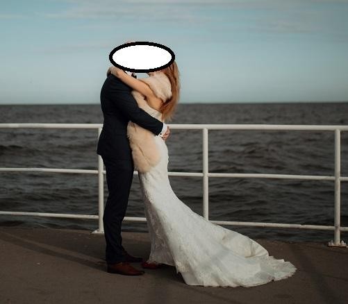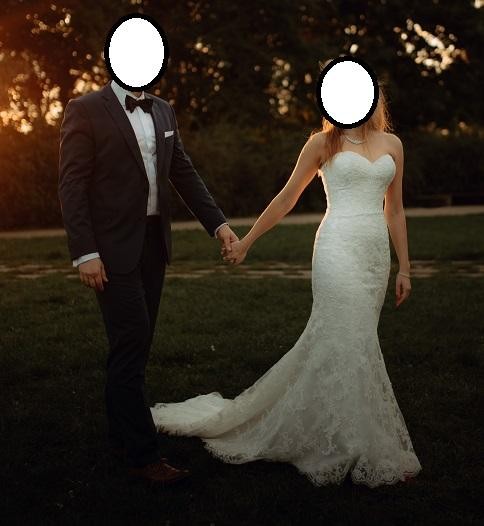 Suknia była nałożona przeze mnie w dniu ślubu oraz na sesję (bez wchodzenia do wody, itp.). Od razu została wyczyszczona w profesjonalnej pralni chemicznej i schowana w foliowy pokrowiec a następnie w swój własny pokrowiec tekstylny.