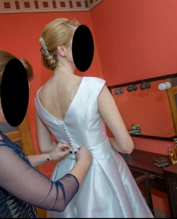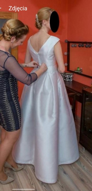 Krój sukni jest skromny i ponadczasowy jednak dzięki połyskującemu materiałowi (nie jest to satyna) staje się ona bardzo elegancka i stylowa. Kolor sukni jest śnieżnobiały.