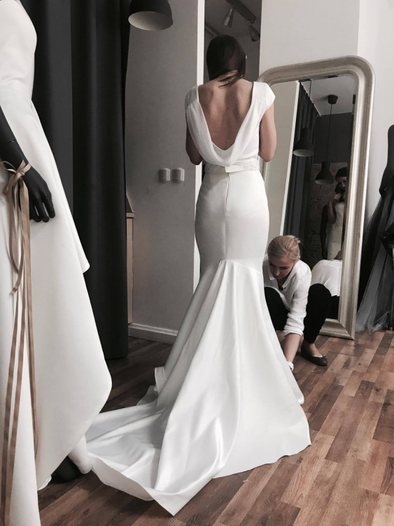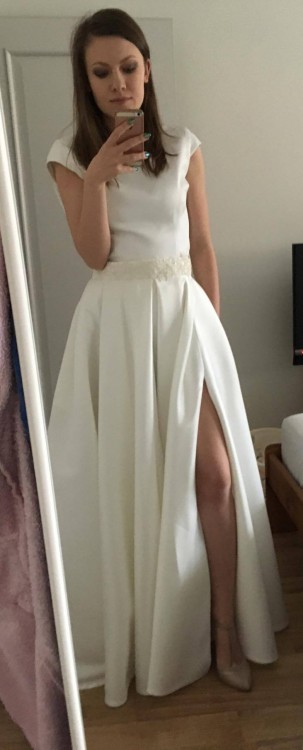 Kolor śmietankowy, satyna jedwabna. Z tyłu wszyty szyfonowy szal. Suknia składa się z 4 części: body, spódnica nr 1 syrenka z długim trenem, spódnica nr 2 księżniczka z rozporkiem i kieszeniami, pasek ręcznie wyszywany wysokiej jakości koronką z koralikami. Przymiarka w Gdyni :-)