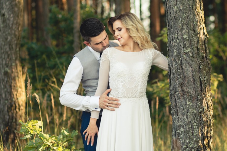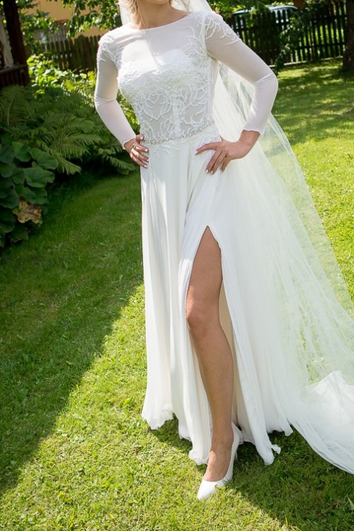 Suknia z długim rękawem, góra - z delikatnej siatki, na ramionach na górze i i piersiach delikatna gipiura - (nie krępuje ruchów, nie została naruszona) Posiada wszyte poduszki i delikatne cekiny, które ślicznie błyszczą się w słońcu i świetle.