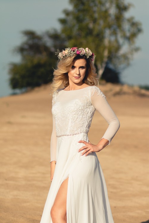 Dół - muślinowy, z dwoma rozporkami na bokach, dzięki czemu suknia jest bardzo zmysłowa.