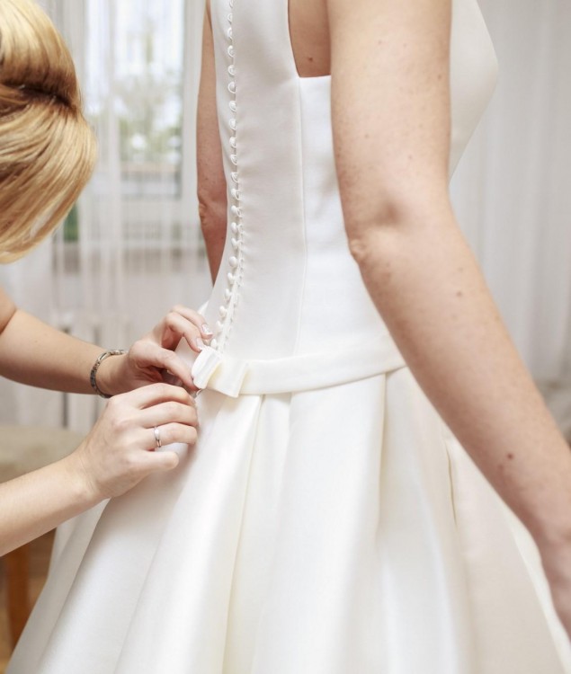 Suknia była dopasowana w talii z zachowaniem możliwości wrócenia do pierwotnej szerokości. Poprawki nanoszone były w salonie Flossmann. Suknia nie była skracana na długości (wzrost 177cm+4cm obcas).