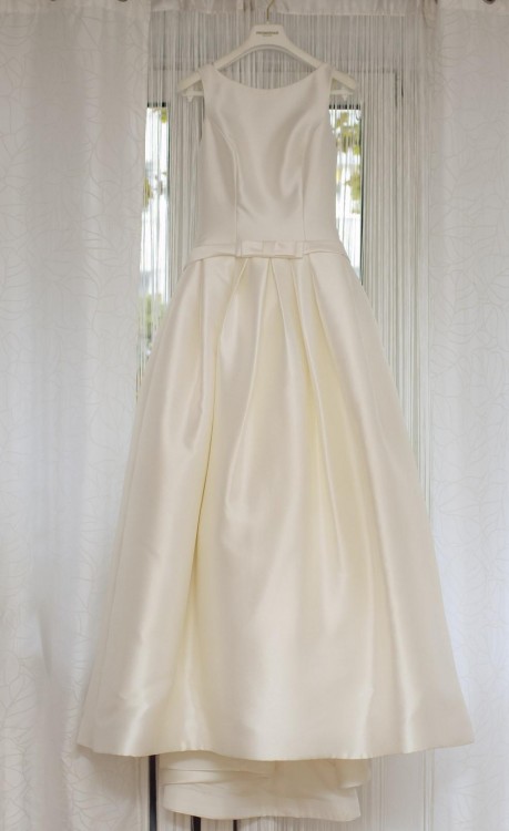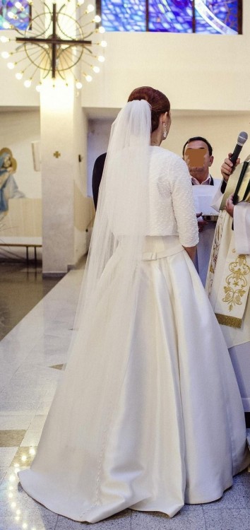 Suknia wykonana z jedwabiu MIKADO w kolorze IVORY, nie mnie się. Faktura i rodzaj materiału całkowicie inny niż dostępne w Polsce Mikado. Suknia pięknie podkreśla talię, gdyż ma lekko obniżony stan. Tył sukni efektownie skrojony, na całej długości zdobiony guzikami obszytymi tym samym materiałem, dwie ozdobne kokardy (przód i tył). Bardzo wygodna, nieograniczająca ruchów w tańcu.