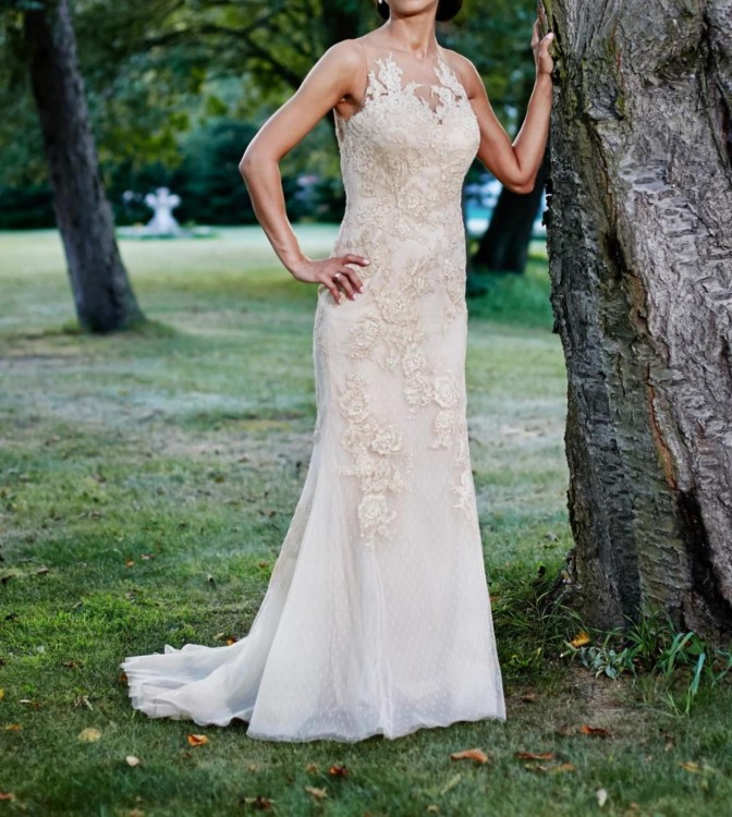 Wspaniała, koronkowa suknia ślubna syrena firmy Pronovias w rozmiarze 34/36. Zarówno przód jak i tył sukni udokerowany jest koronkowymi aplikacjami. Suknia jest w kolorze beżowym/biszkoptowym, a tył zakończony małym trenem. Suknia ubrana tylko raz w 2016 roku. Suknia nie jest uszkodzona i została wyczyszczona w pralni chemicznej.Istnieje mozliwosc dowiezienia sukni w okolice Warszawy,Radomia.