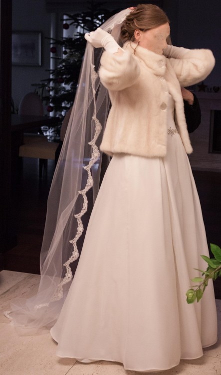 Do sukni dołączam GRATIS białe rękawiczki o długości do łokcia (idealne gdy ślub odbywa się zimą) oraz dwa welony - jeden o długości 3 m wykończony delikatną hiszpańską koronką, kupiony za 600zł. Drugi, krótszy, idealny na przyjęcie weselne, kupiony za 200 zł.