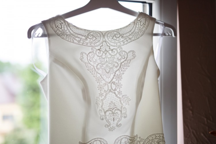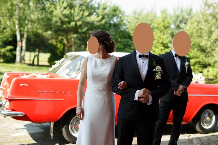 Suknia jest prosta, elegancka, starannie uszyta, z delikatnymi koronkami naszywanymi z przodu. Z tylu efektowna koronka, którą również wykończony jest tren. Tren podpinany na zewnątrz, na guziczek i dwa napy,