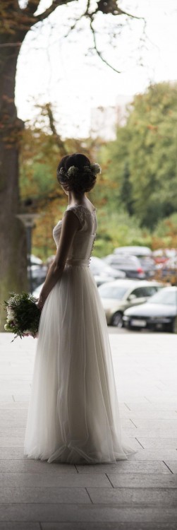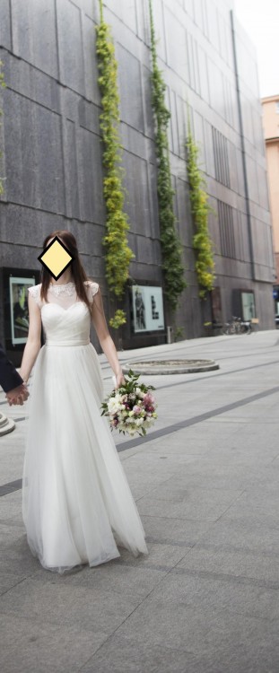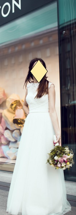 Suknia z tyłu zapinana jest na suwak oraz guziczki.