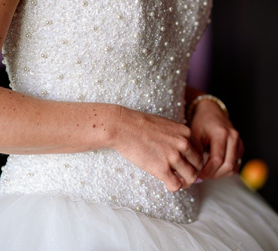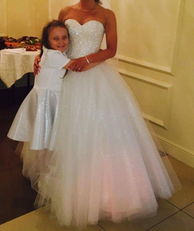 Suknia składa się z wielu warstw tiulu w tym jedna warstwa z mieniącym się z brokatem, bardzo efektownie wygląda w świetle. Gorset zdobiony mieniącymi się koralikami i perłami.