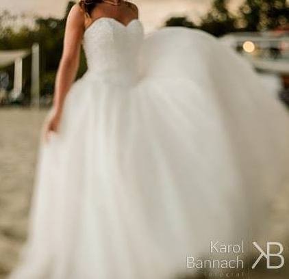 Mam do sprzedania przepiękną suknię ślubną w kolorze ecru zakupioną w salonie sukni ślubnych w Elblągu. Rozmiar 36 - sukienka była indywidualnie dopasowywana, gorset jest z tyłu sznurowany, więc jest możliwość regulacji i dopasowania do sylwetki posiada również zapięcie dzięki czemu masywnie trzyma się sylwetki. Wzrost - 166 cm plus obcas ok. 10 cm.