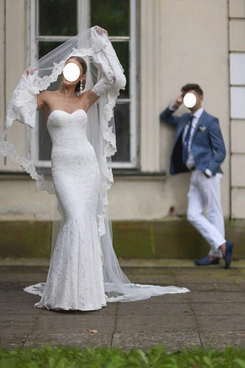 Posiadam dodatkowo kawałki materiału, gdyby ktoś ewentualnie potrzebował, by poszerzyć rękawki. W gratisie dorzucam krótki welon wykończony koronką, również zakupiony w salonie White.