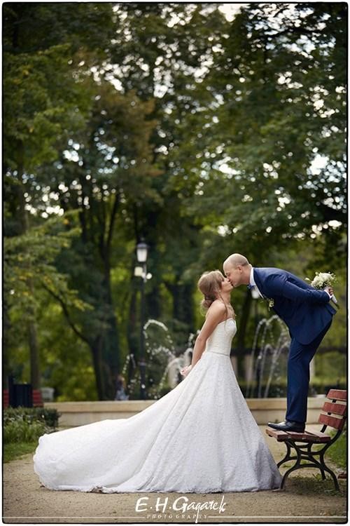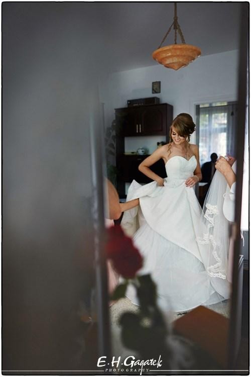 Suknia ślubna marki Mystic, zakupiona w salonie Mariees de Paris, pokryta francuską koronką na całej długości.