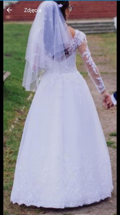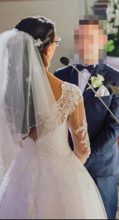 Sprzedam suknię ślubną z długim rękawem, wykonaną z koronki na której znajdują się delikatne cekiny. Suknia posiada koło ale można je wyjąć. Szyta na miarę w rozm 34/ 36, na wysokość 168 plus 4 cm obcas. Założona tylko w dniu ślubu. Wyczyszczona w profesjonalnym salonie sukien ślubnych. Nie posiada żadnych uszkodzeń ani zabrudzeń. Stan idealny.