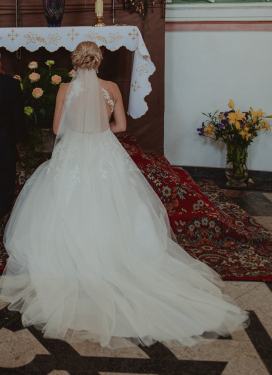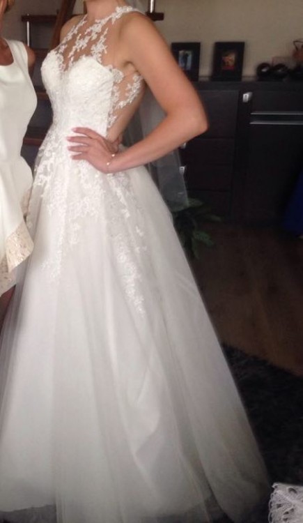 Sprzedam piękną suknię ślubną z podpinanym trenem i oryginalnym tyłem- wspaniale eksponującym plecy. Suknia jest w kolorze perłowej bieli. Uszyta jest na wzrost 167-168 cm plus obcas ok 8 cm. rozmiar- 36-38. Stan idealny ! Suknia pochodzi z kolekcji hiszpańskiego projektanta! Starannie i solidnie wykonana!