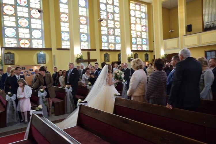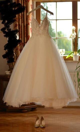 Sprzedam przepiękną suknię ślubną rozmiar 36,góra koronkowa z kryształkami,dół tiulowy ,są wbudowane w suknie dwa koła,.Sukienka ma również wbudowany stanik dzięki czemu lepiej się układa.Na wszystkich gościach robiła ogromne wrażenie.Ma piękny doczepiany tren,który jest idealny na wejście do kościoła.Dodatkowo pod suknię był szyty welon,który ma taką samą koronkę jak góra sukni.