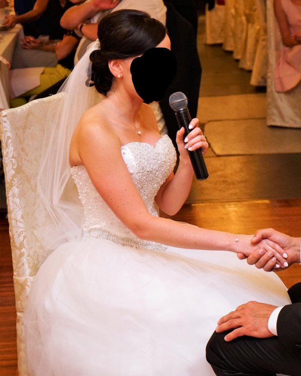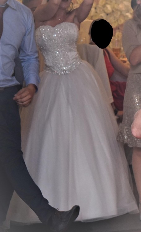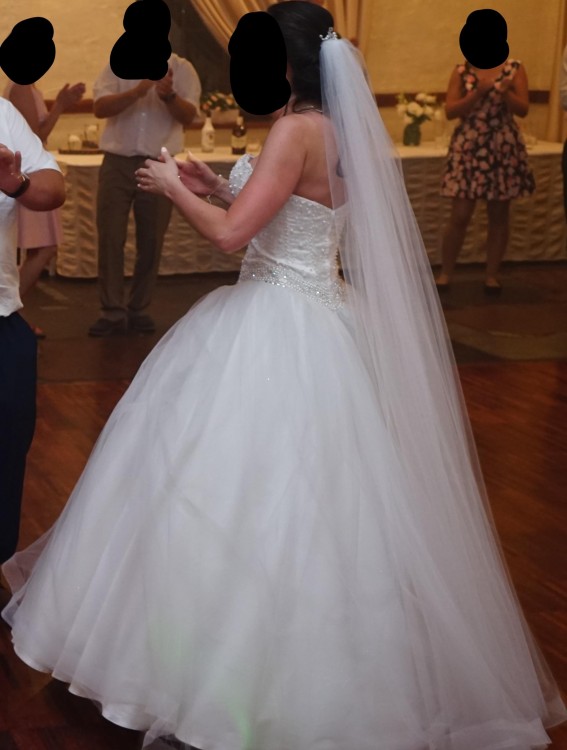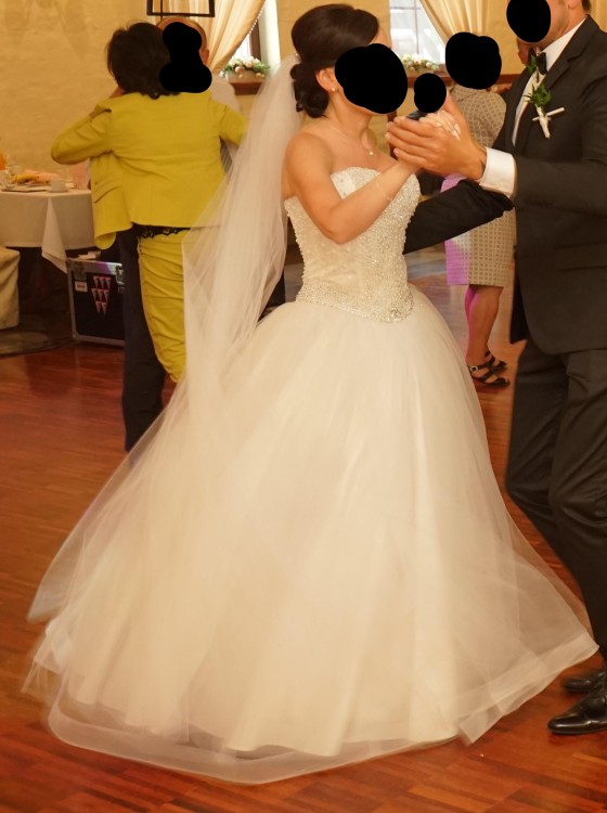 Witam, mam na sprzedaż suknię ślubną typu princessca zakupioną w Salonie w Opolu, szyta nowa na zamówienie. Suknia jest koloru białego, rozmiar 34, wzrost 163 + obcas 9 cm. Suknia ma przepiękny gorset wyszywany błyszczącymi kryształkami i perełkami, jest lekka i bardzo wygodna. W gorsecie wszyte jest ukryte sznurowanie dzięki czemu trzyma się i nie zsuwa. Suknia była czyszczona, wiec jest gotowa do założenia. Dodatkowo gratis dodam długi prosty welon, koszulkę do założenia do kościoła oraz koło.