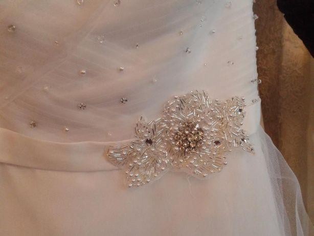 Sprzedam przepiękną suknie ślubną marki Sincerity (model 3812) z odpinanym trenem. Rozmiar 10, ale była zwężana- będzie pasować na osobę noszącą rozmiar 36-38 i mającą do 171 cm wzrostu (ja mam 171 cm plus 5cm szpilki)