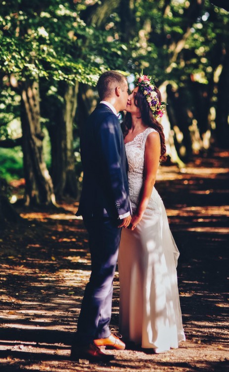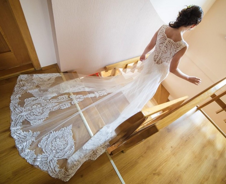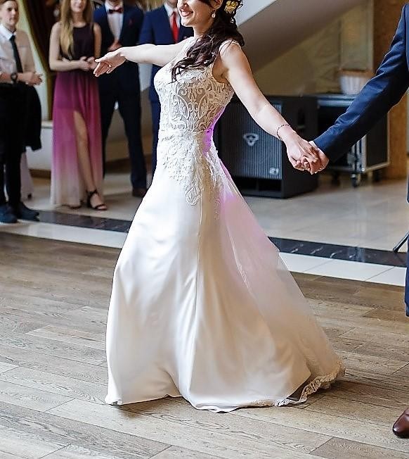 Pięknie eksponuje plecy, koronkowy podpinany tren, który ładnie układa się, nie przeszkadzając w tańcu (zwłaszcza w obrotach).