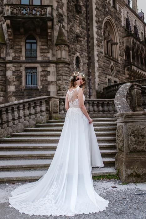 Sprzedam suknię ślubną, kolor śmietankowa biel, szytą na 164 cm wzrostu + 8 cm obcas. Stan sukni idealny. Góra sukni składa się z gorsetu w kolorze cielistym, który jest zdobiony ręcznie naszywaną francuską gipiurą, idealnie jak na zdjęciach. Plecy wycięte w V, także zdobione gipiurą w kształcie serca. Całość daje cudowny efekt gipiury nałożonej na skórę. Pas sukni w kolorze cielistym, zdobiony diamencikami – pięknie podkreśla talię. Suknia posiada dopiany pod paskiem tren, zakończony tą samą gipiurą co suknia. Cudownie uklada się za idącą do ołtarza Panną Młodą. Suknia posiada wszyte miseczki, możliwość dopasowania misek i całej sukni we własnym zakresie – mogę podać namiary do świetnej krawcowej! Do sukni dodaję średniej długości welon wykończony gipiurą i halkę.