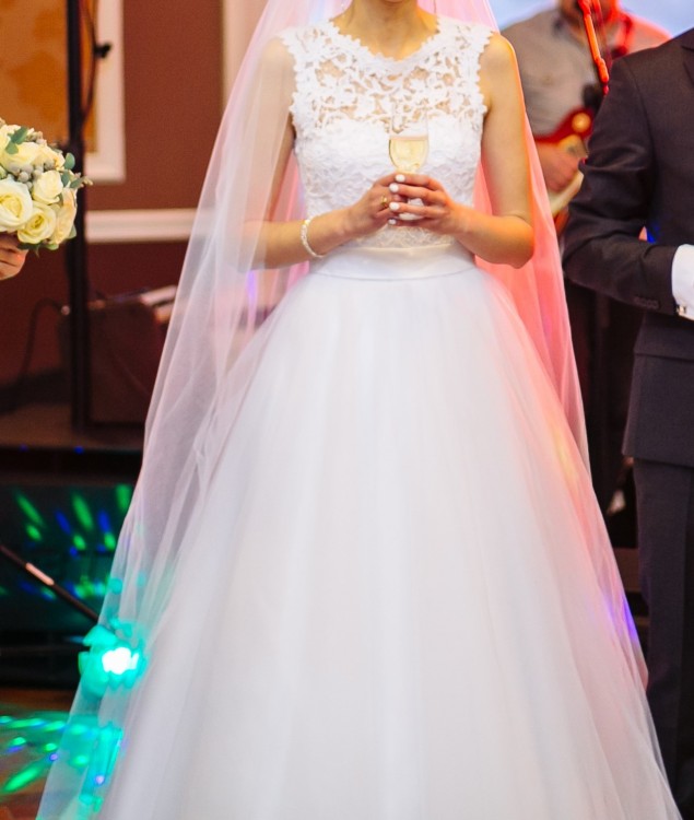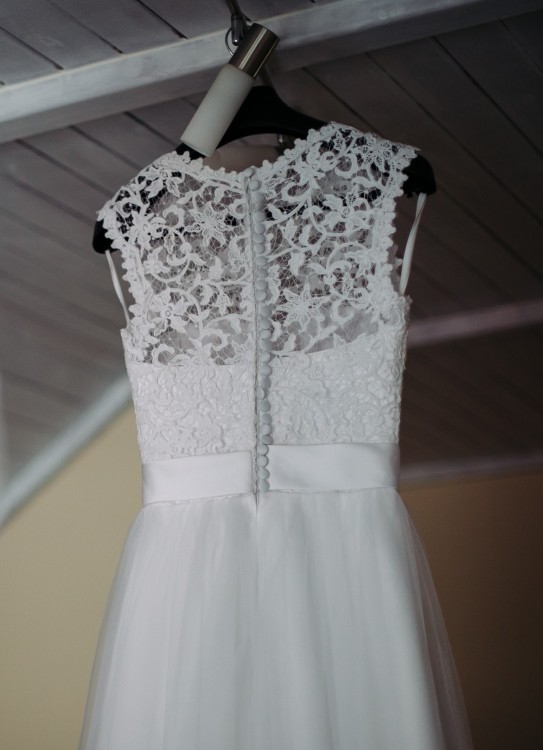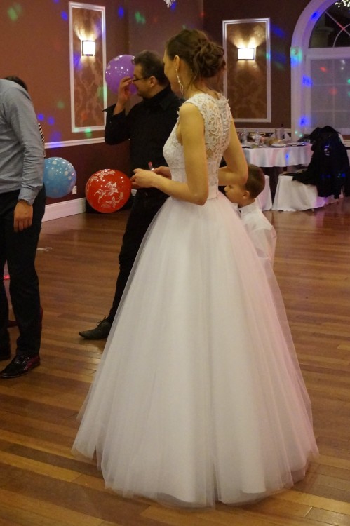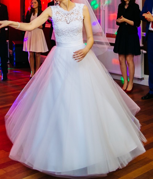 Góra sukni wykonana jest z grubej gipiury, dół tiulowy. Zapinana na zamek, zakryty guziczkami. Ma wszyte miseczki, dlatego nie ma konieczności zakładania pod nią stanika. Posiadam do niej również regulowane koło.